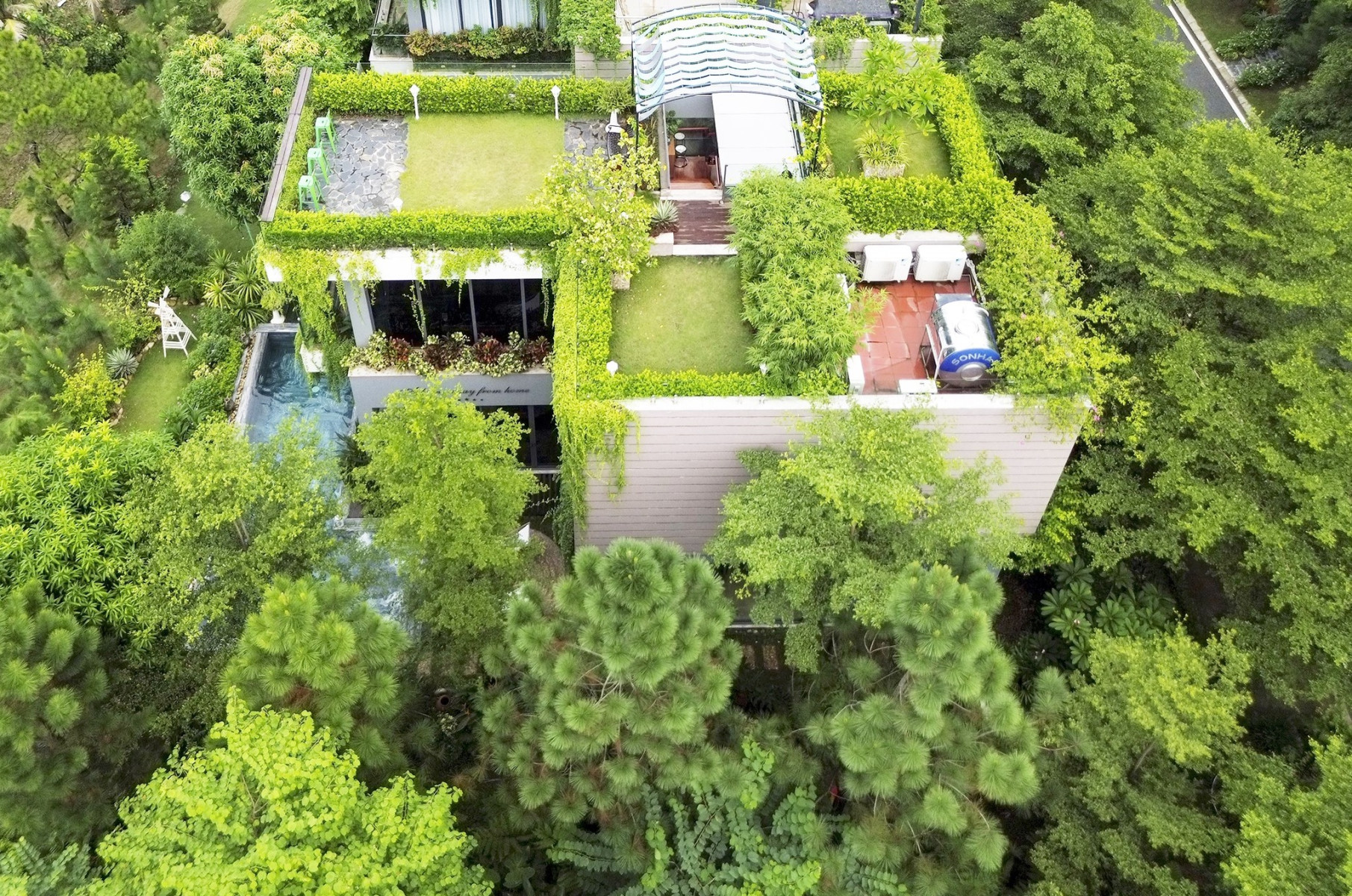 Tổng diện tích sử dụng khuôn viên nhà mình là 530m2 (trong đó 250m2 là sổ đỏ lâu dài + 280m2 đất lưu không xung quanh được sử dụng làm sân vườn), mình chỉ sử dụng khoảng 100m2 xây nhà ở (2 tầng với 3 phòng ngủ + 1 sân vườn trên mái), diện tích còn lại làm bể bơi và sân vườn. Mình mệnh hỏa, hợp với mộc thêm với điều kiện tự nhiên, đất đai, khí hậu trên này rất tốt nên trồng cây nào cây nấy phát triển rất khỏe & nhanh. Ai tới cũng phải ngạc nhiên với độ phủ xanh nhanh của sân vườn nhà mình.